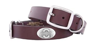 Your pet can show off their Ohio State Buckeyes school and team spirit too with this brown leather collar. Made of genuine oil-tanned leather, it features 2 silver gun metal concho logos and matching hardware. To assure a safe and comfortable fit for your pet, place two fingers between the neck and the measuring device and note the indicated length. Size Medium is 1-3/8-Inch wide and fits lengths 17-Inch - 21-Inch.
